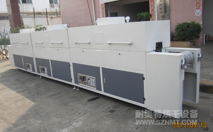 外形尺寸:總長(zhǎng)7000*高1400*寬620mm;進(jìn)料部分長(zhǎng)500mm,出料部分長(zhǎng)500mm;烘干部分長(zhǎng)6000mm,分3段,每段2000mm;